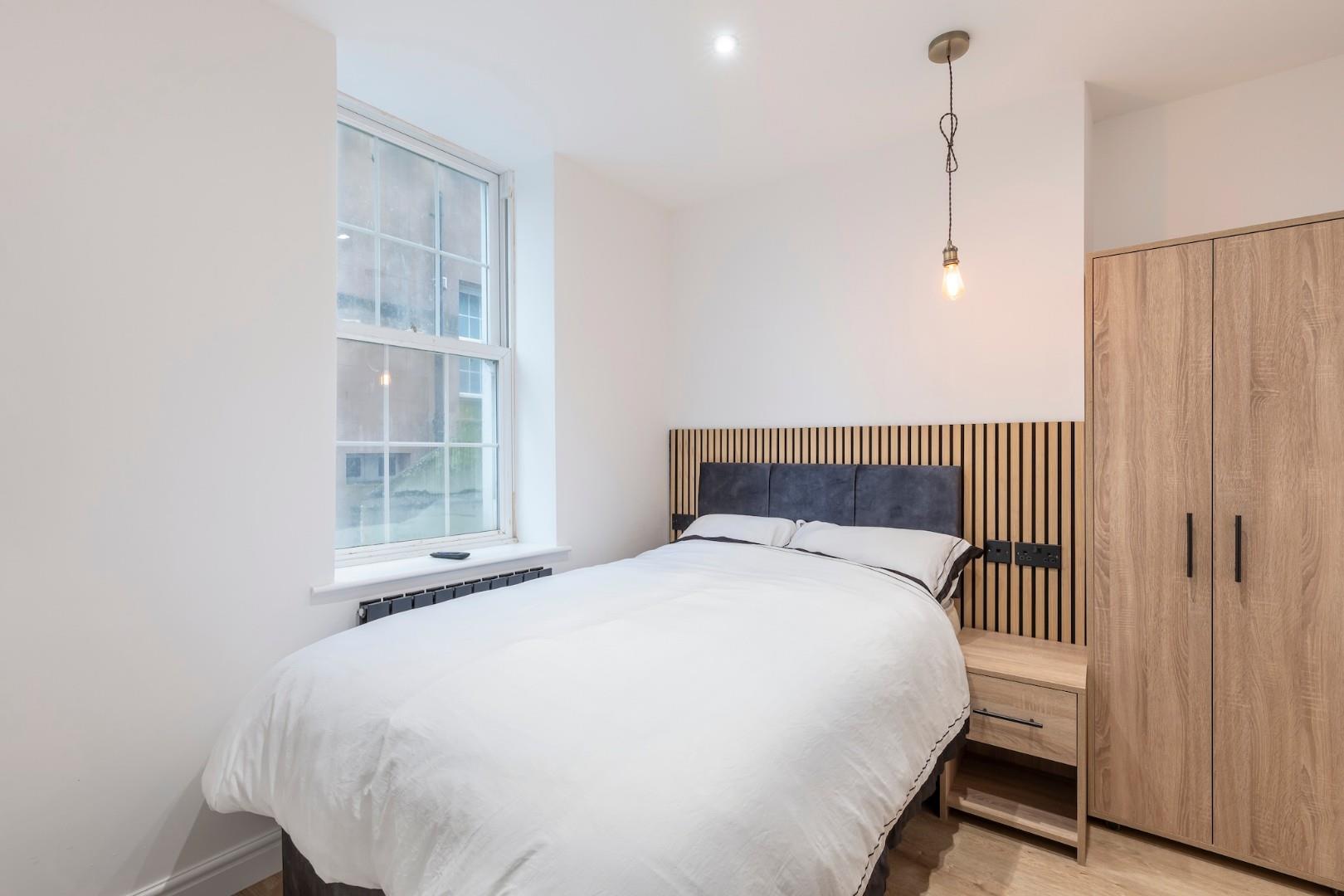This beautifully finished en-suite double bedroom is a real standout, with a generous bay window that fills the room with natural light and gives it a bright, uplifting feel. Fully furnished with stylish, brand-new pieces including a comfortable double bed, quality mattress, wardrobe, chest of drawers, desk, chair and wall-mounted TV, the room also benefits from a sleek, modern en-suite shower room finished to an excellent standard.